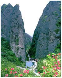 芙蓉峡,从鼎湖峰沿好溪上行三四公里,渡溪入山谷,两侧峭壁通体漆黑,整座山体又如钢铁铸成的石城堡。越往里走,峭壁愈高,山谷愈窄。最狭处,中裂如门,仅容一人穿过,大有“一夫当关,万夫莫开”之势,故叫铁门峡。电影《阿诗玛》中,阿黑张弓射穿山崖的镜头就取于此。入内又是一洞天,四周高崖围立,中间绿草成茵,叫紫芝坞,相传是东海八仙饮山泉尝紫芝之处。坞内有屋基一座,是明代四位高人结庐隐居的遗址。