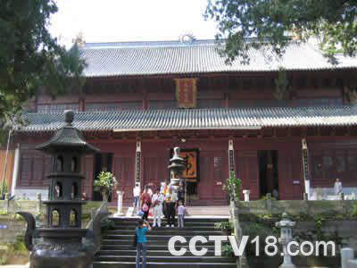 天台山的国清寺位于县城北3公里,景区面积2.4平方公里。国清寺始建于隋开皇十八年(598年),初名天台寺,后取“寺若成,国即清”改名为国清寺。南宋列为“江南十刹”之一,现存建筑为清雍正十二年(1734年)奉敕重修。全寺总面积7.3万平方米、分为五条纵轴线,正中轴由南而北依次为弥勒殿、雨花殿、大雄宝殿、药师殿、观音殿;还有放生池、钟鼓楼、聚贤堂、方丈楼、三圣殿、妙法堂(上为藏经楼);伽蓝殿、罗汉堂、文物室等,构成一个拥有2万多平方米、8000余间房屋的古建筑群。寺宇依山就势,层层递高,既有佛教建筑严整对称的特点,又给人以灵活自如之感。