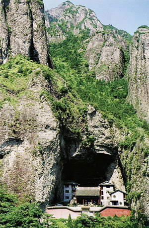 观音洞隐于合掌峰中,洞高113米,深76米,宽14米,洞中累有九层楼阁。太阳正照洞底大殿,每天才数分钟。观音洞为雁荡山第一洞天,深藏玄机,经年香烟缭绕。