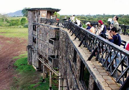 小贴士:要在那里投宿,游客们要先在中央省省会尼耶里的一个“套马车”旅馆集中,放下行李,然后套上马车(从前坐马车,现在乘旅游汽车),在手持猎枪的欧洲人导游带领下,向“树上旅馆”进发。旅游车在林间小路上缓行,不时会遇到穿越公路的狒狒、大象、长颈鹿和羚羊,好像是来迎接游客一样。约莫过一个小时,车子在一个山脚停下,导游请游客下车并宣布几条安全注意事项,然后整队上山,步行约一二百米,写着“树顶”两字的牌楼和掩映在绿树丛中的旅馆建筑便展现在眼前。