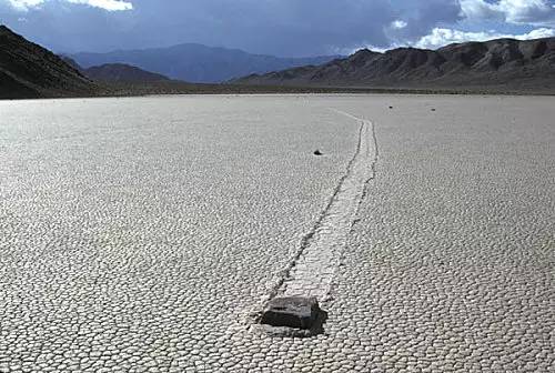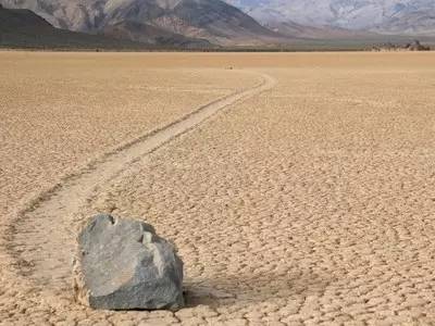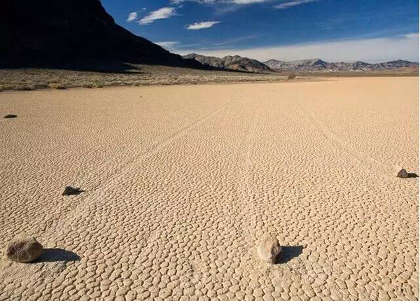 在无人类与动物的介入下,死亡谷的岩石居然能沿着山谷漂流而下,转弯时形态各异,还能“路过留名”,留下走动的痕迹!其推动力是什么,移动速度为多少,一切都还在探究中。