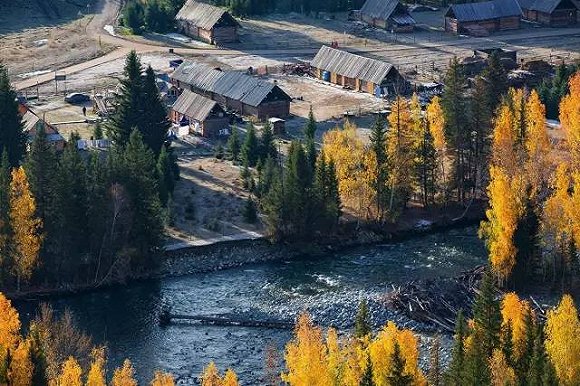在群山环抱的开阔地上,禾木村静静地躺着,图瓦人的尖顶小木屋、牲口围栏随意地散落在村子的各个角落。