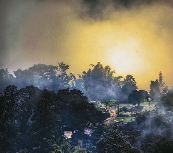 斜阳透过老榕树的叶隙,映射出茅屋错落,竹楼有序。暮归的老牛悠闲信步,不时发出浑厚的叫唤,把佤山金色黄昏唱晚。