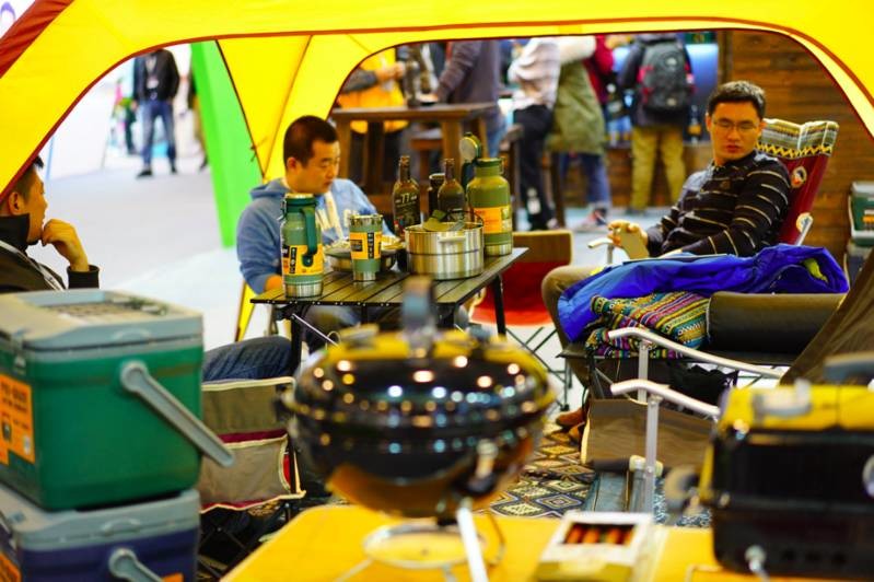 ▲ 展会现场,户外露营装备引来许多观众体验。