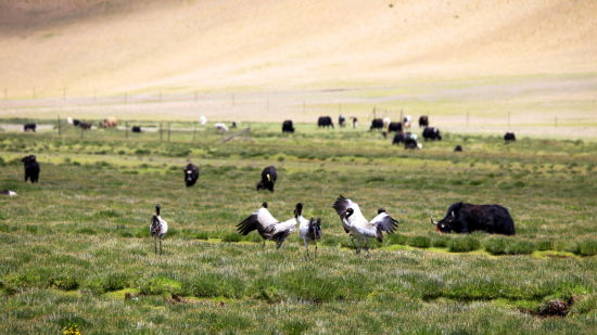 与鹤起舞。拉萨一直不断加大生态环境保护力度,生态环境持续向好,成为众多鸟类的乐园。美丽优雅的黑颈鹤可以称为拉萨冬日旅游的一道亮丽风景线,冬季的拉萨,成群的黑颈鹤飞临拉萨,与斑嘴鸭、赤麻鸭、斑头雁、绿翅鸭、绿头鸭等十几种珍稀水禽安然在此越冬。