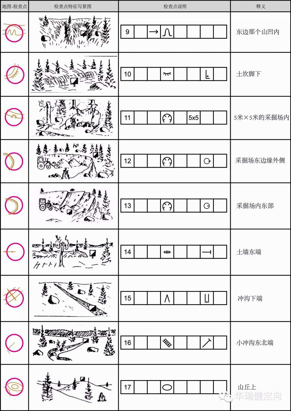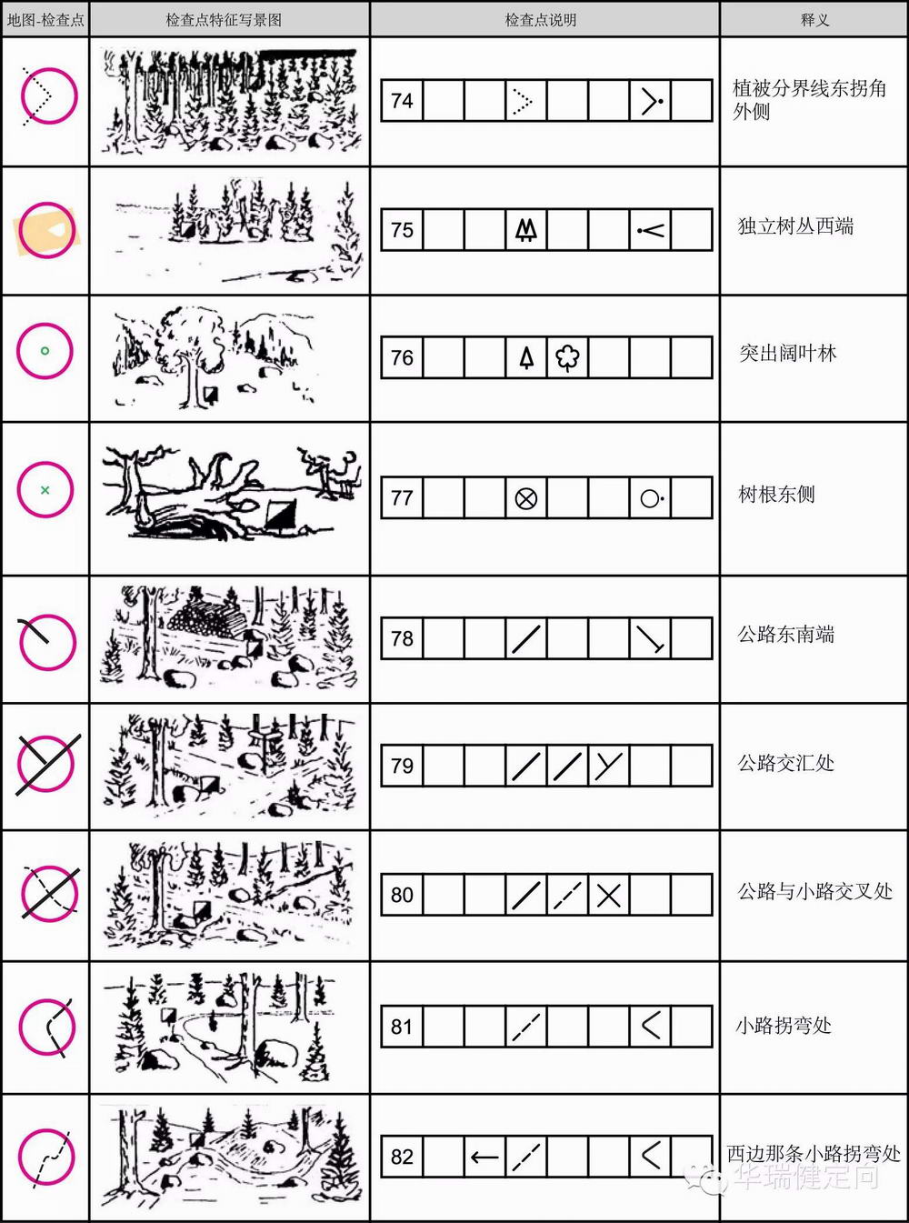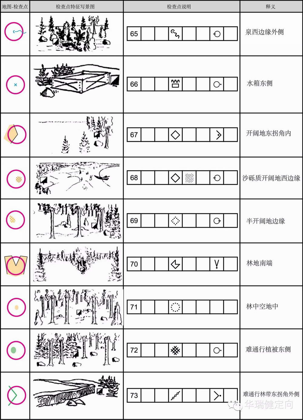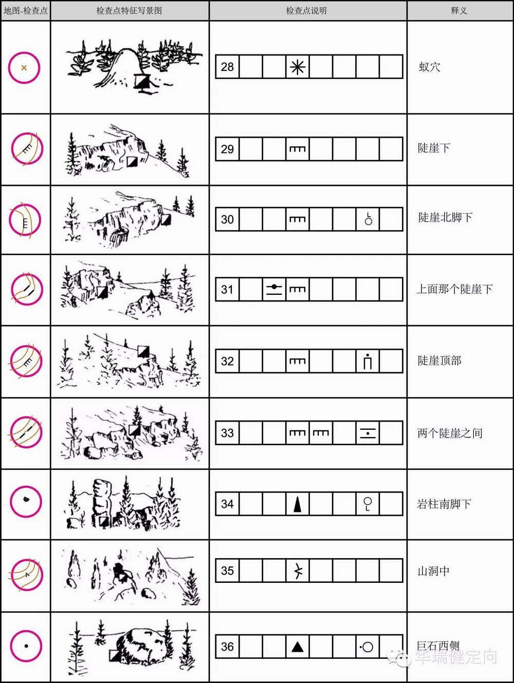 检查点说明表是为定向运动参与者提供的一套含义固定,而且不用文字表述就能理解检查点位置特征的符号,检查点说明表由检查点说明符号组成,目的是准确布设检查点和快速寻找检查点。