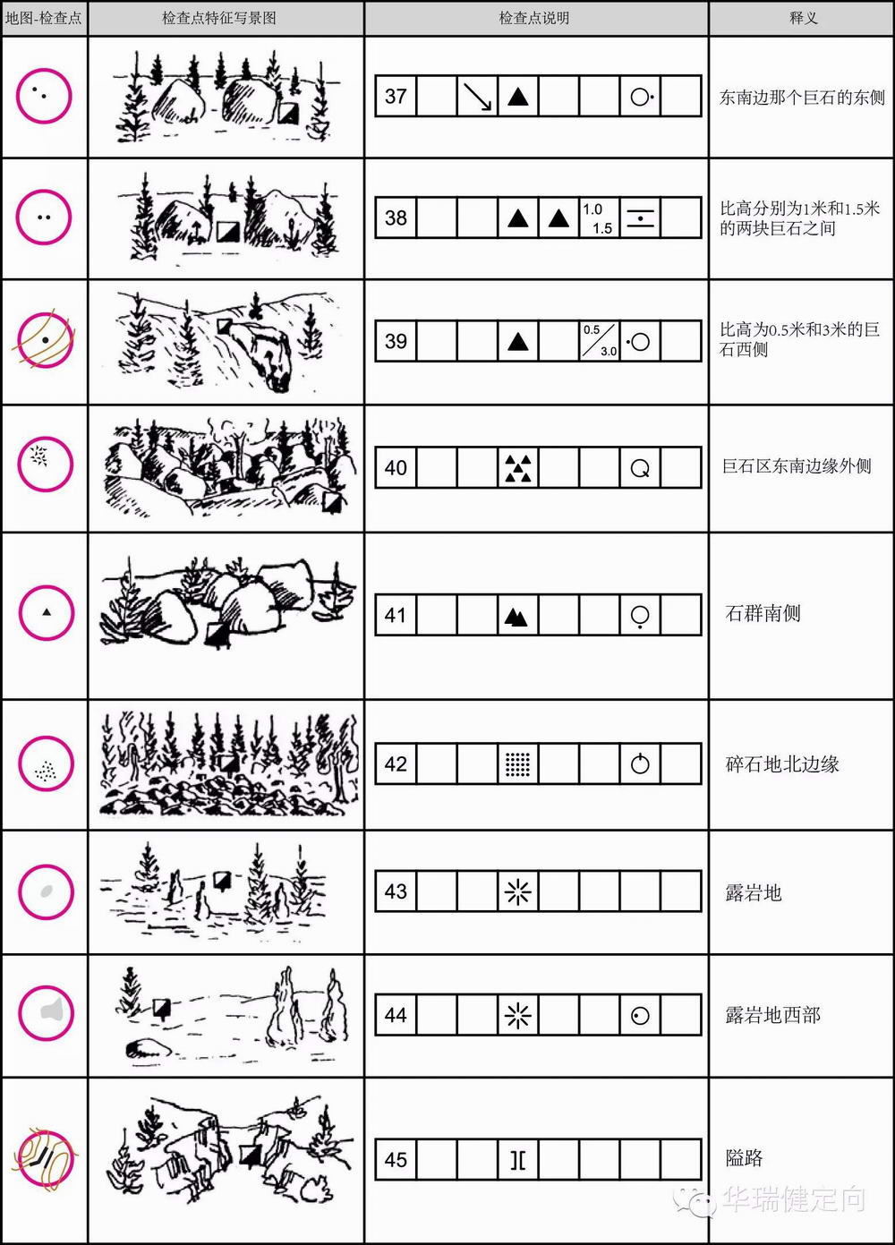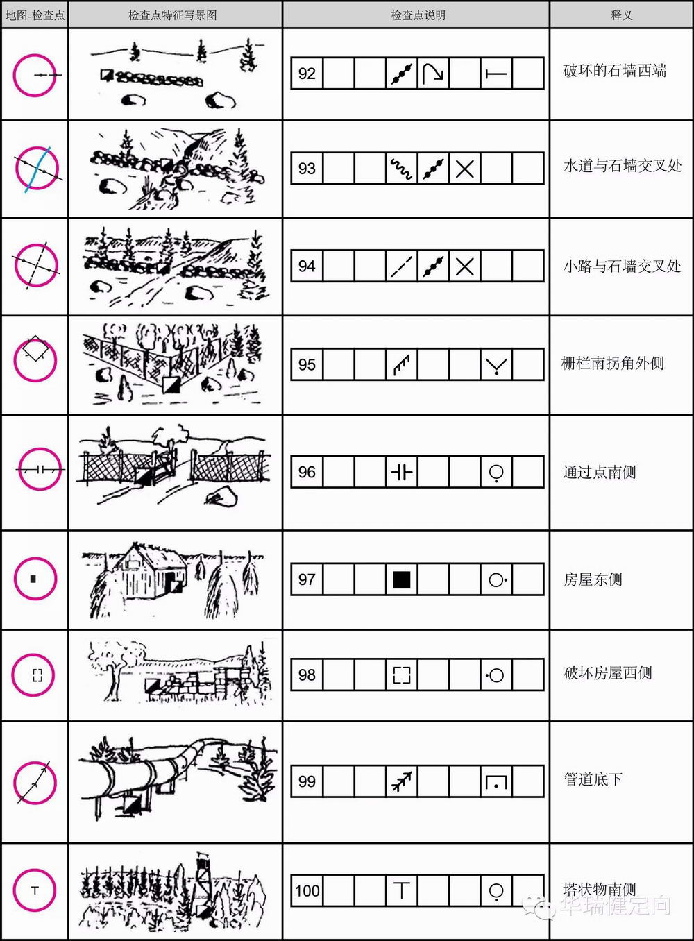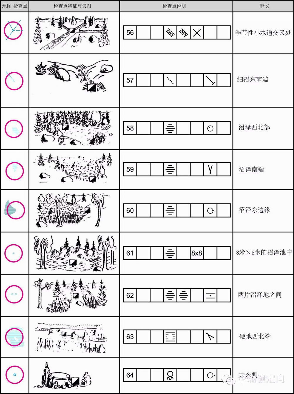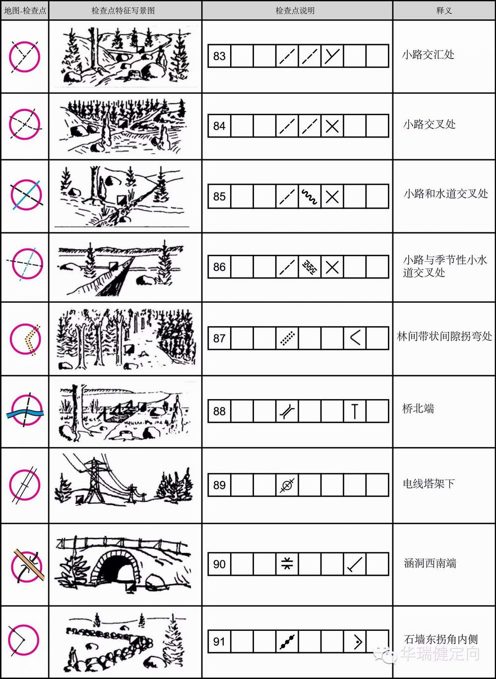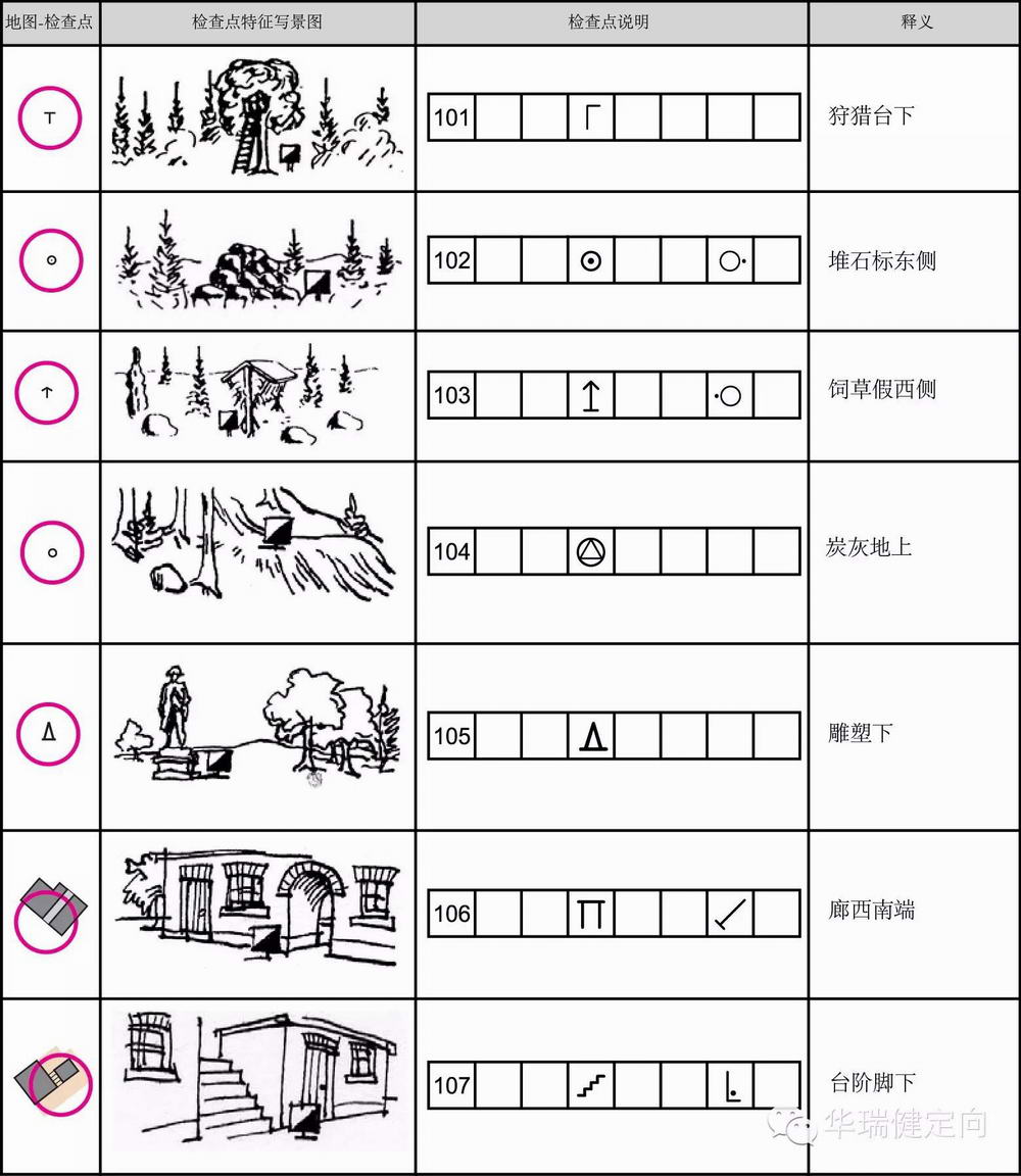 检查点说明表是为定向运动参与者提供的一套含义固定,而且不用文字表述就能理解检查点位置特征的符号,检查点说明表由检查点说明符号组成,目的是准确布设检查点和快速寻找检查点。
