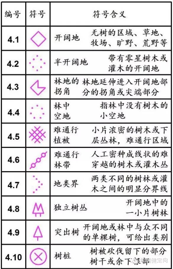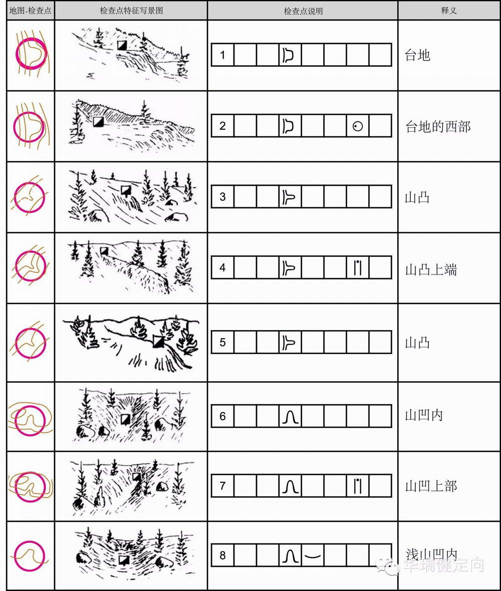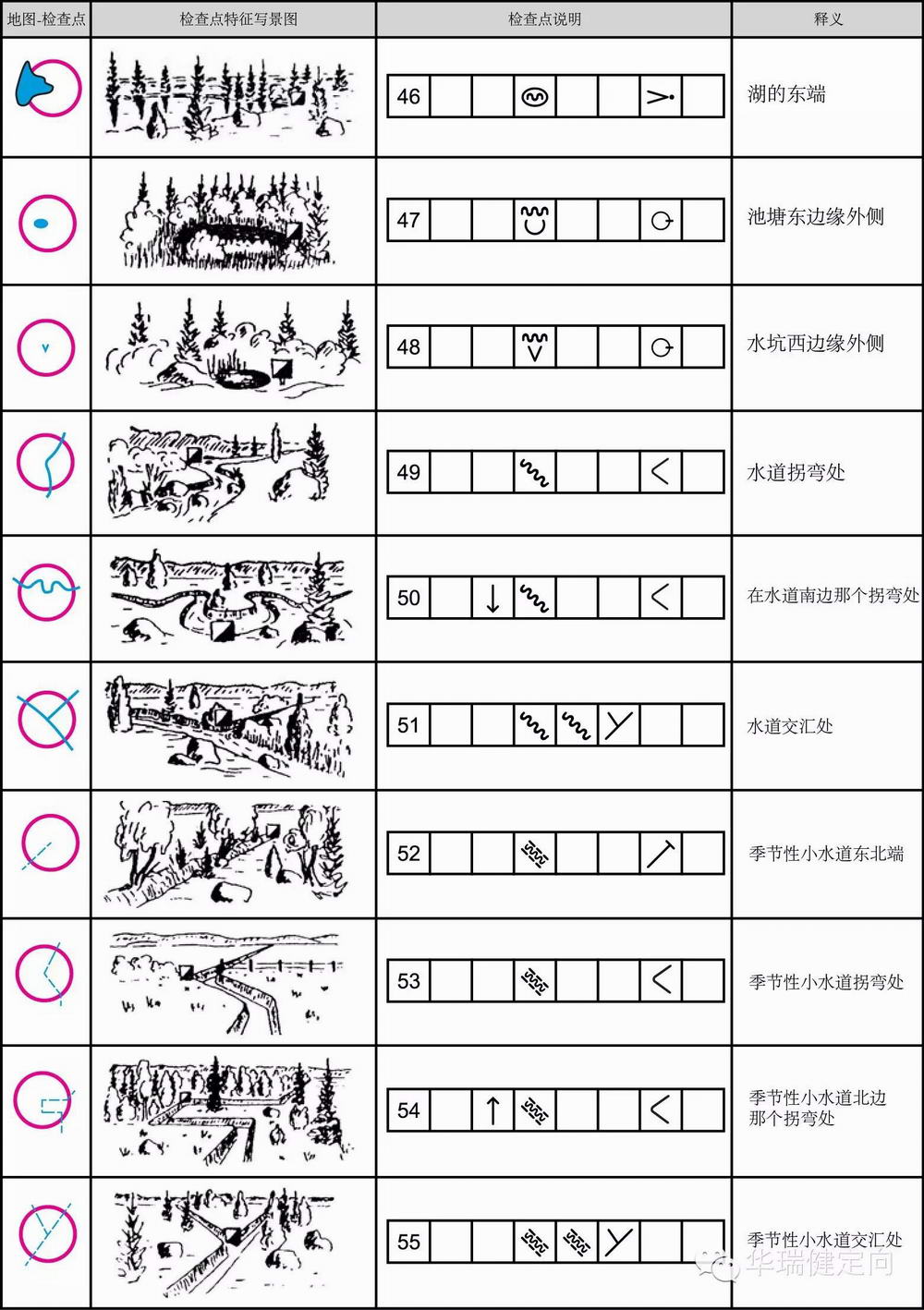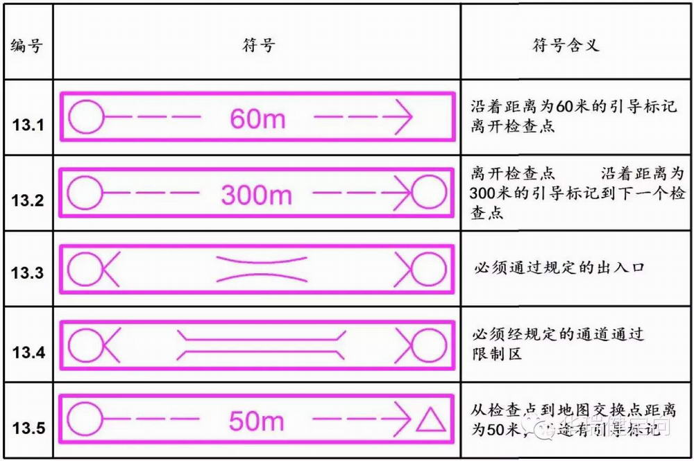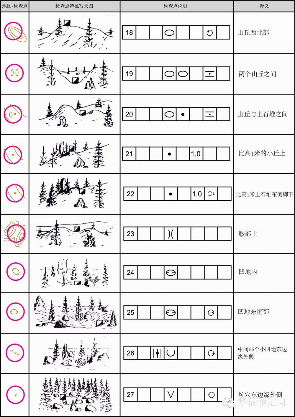 检查点说明表是为定向运动参与者提供的一套含义固定,而且不用文字表述就能理解检查点位置特征的符号,检查点说明表由检查点说明符号组成,目的是准确布设检查点和快速寻找检查点。