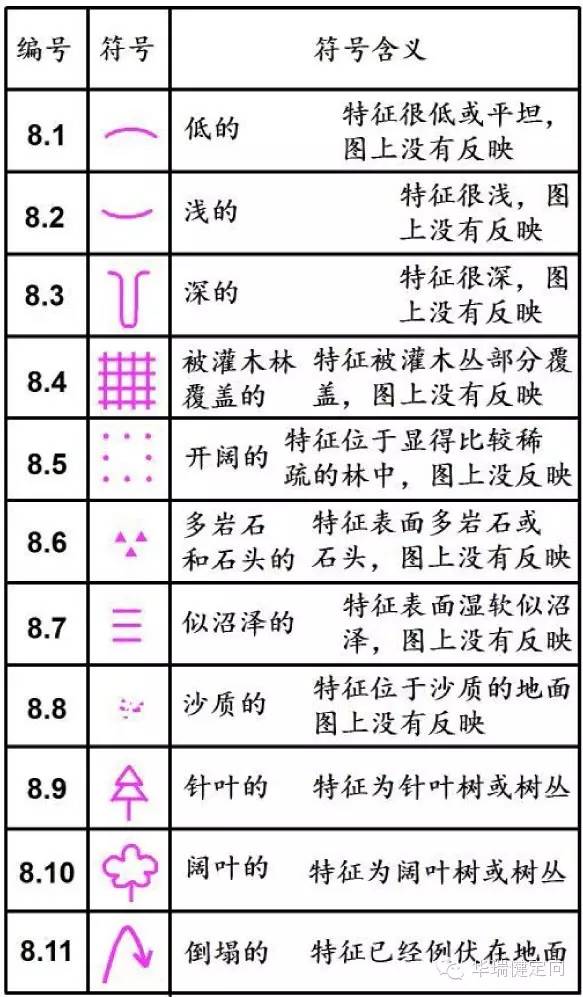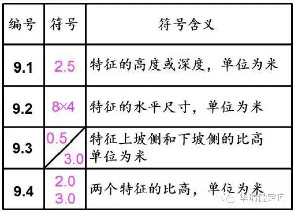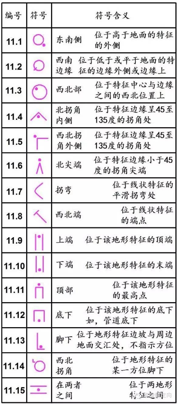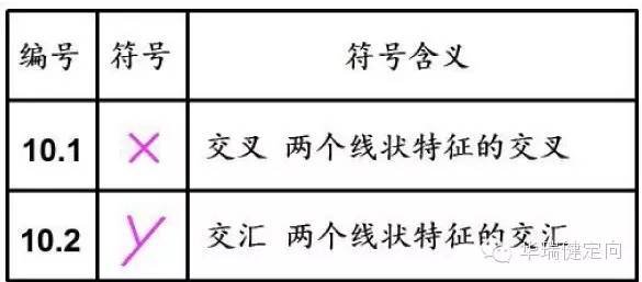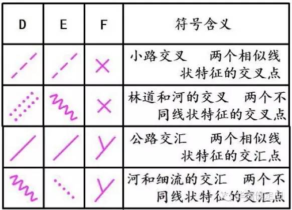 4、F列符号说明:描述检查点所处地形的尺寸特征,也用于说明两相邻线状地形的相交关系(交叉、交汇)。