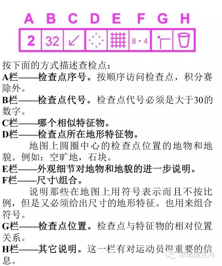 3、各检查点说明:按检查点序号描述检查点特征,点标旗与检查点特征间的位置关系,由A-H 8个栏目组成;