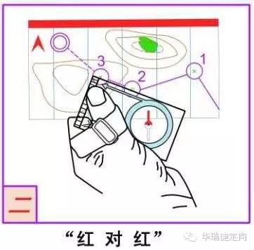 第二步:水平持握指北针,转动身体,直到指北针磁针与地图磁北线平行,并且磁针北端(红色端)与地图磁北线北端一致。前进方向箭头所指的方向就是目标所在方位。