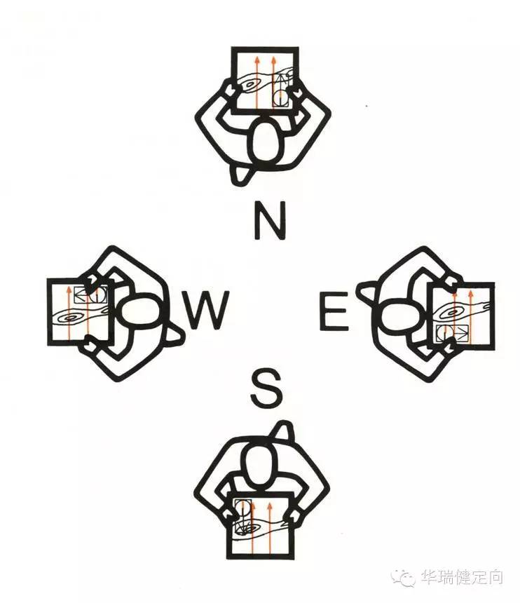 1)确定自己手持指北针正好位于身体前方正中线位置。手持指北针偏向身体的任一一边可能导致在看磁针时出现错误。
