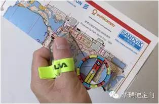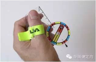 4)用一根绳索将刻度盘指北针安全地系在自己的手腕上。拇指型指北针固定在拇指上。为了安全现用一根绳索系在手腕上。