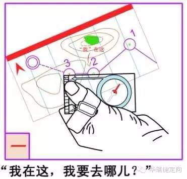 第一步:将指北针置于地图之上,使指北针前进方向线平行(或重叠)于目前站立点与目标之间的连线